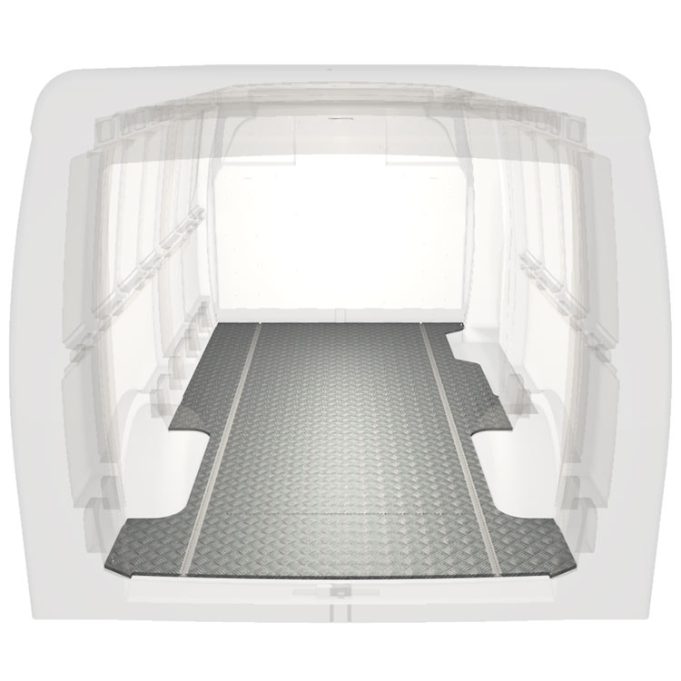 Lette og robuste standardgulve til varebiler til en Iveco Daily med skridsikker aluminiumsplade og lastskinner (langsgående) for hurtig og sikker installation af indretningssystemer og andet tilbehør.