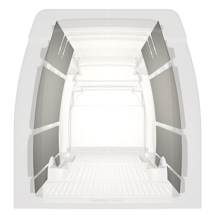 Let færdiglavet beklædning til de indvendige vægge af en Iveco Daily ned dobbelte sidedøre. Beklædningen skaber et lyst og behageligt arbejdsmiljø og er nem at rengøre.