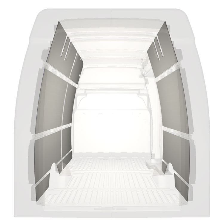 Let panelbeklædning til de indvendige vægge i en Iveco Daily med en sidedør til højre. Beklædningen skaber et lyst og behageligt arbejdsmiljø og er nem at rengøre.