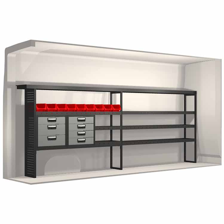 Indretningsforslaget er specielt designet til at passe valgte bilmodel perfekt. For øget funktionalitet og reduceret støj under kørslen er alle hylder udstyret med gummimåtter og skuffer med skum. Monteringssæt medfølger.