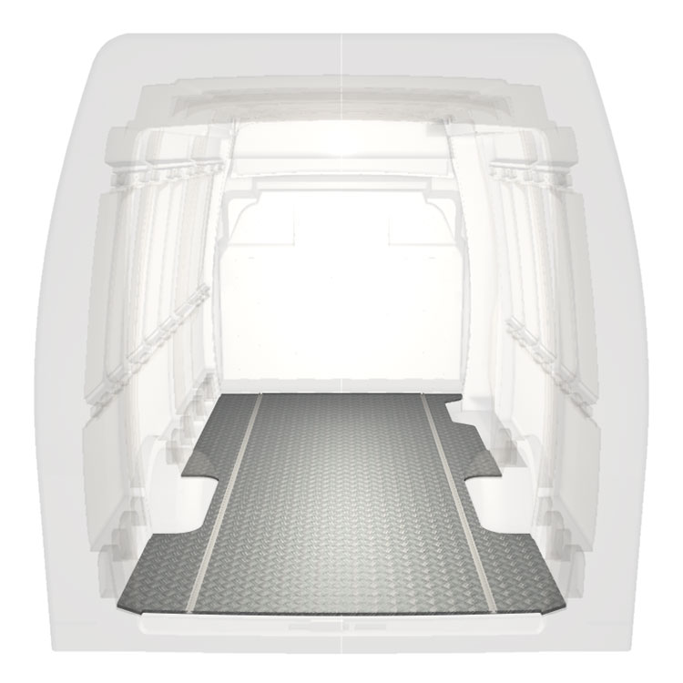 Lette og robuste ekstra lange gulve til en Iveco Daily med skridsikker aluminiumsplade og lastskinner (langsgående) for hurtig og sikker installation af indretningssystemer og andet tilbehør.