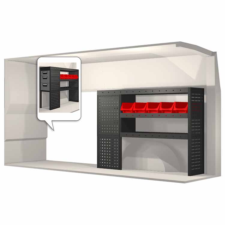 Indretningsforslaget er specielt designet til at passe valgte bilmodel perfekt. For øget funktionalitet og reduceret støj under kørslen er alle hylder udstyret med gummimåtter og skuffer med skum. Monteringssæt medfølger.