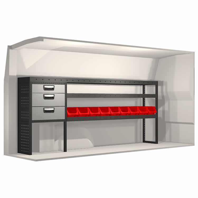 Indretningsforslaget er specielt designet til at passe valgte bilmodel perfekt. For øget funktionalitet og reduceret støj under kørslen er alle hylder udstyret med gummimåtter og skuffer med skum. Monteringssæt medfølger.