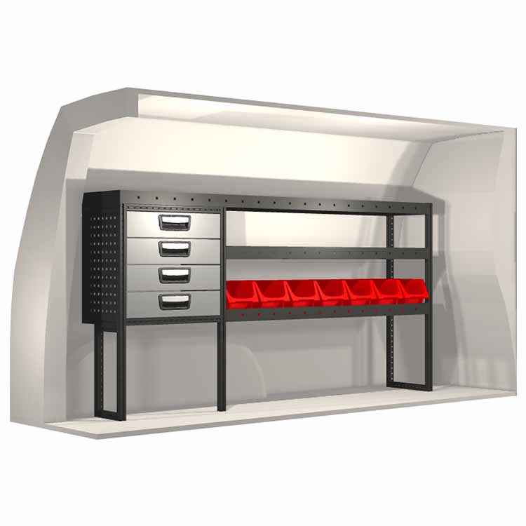 Indretningsforslaget er specielt designet til at passe valgte bilmodel perfekt. For øget funktionalitet og reduceret støj under kørslen er alle hylder udstyret med gummimåtter og skuffer med skum. Monteringssæt medfølger.