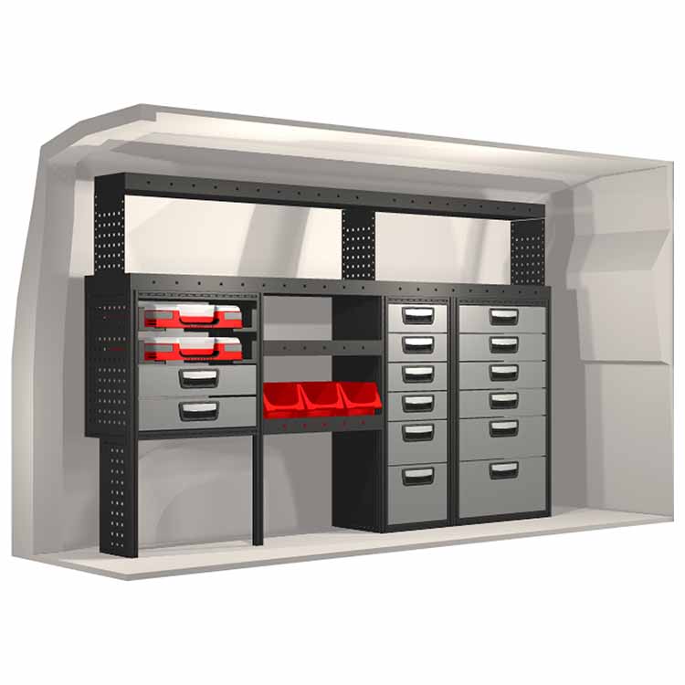 Indretningsforslaget er specielt designet til at passe valgte bilmodel perfekt. For øget funktionalitet og reduceret støj under kørslen er alle hylder udstyret med gummimåtter og skuffer med skum. Monteringssæt medfølger.