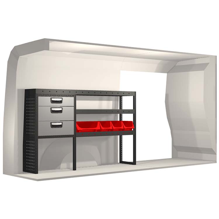 Indretningsforslaget er specielt designet til at passe valgte bilmodel perfekt. For øget funktionalitet og reduceret støj under kørslen er alle hylder udstyret med gummimåtter og skuffer med skum. Monteringssæt medfølger.