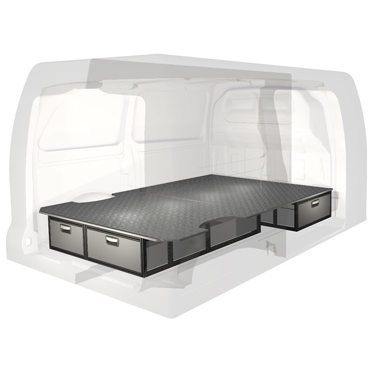 The kit is designed to be fitted on top of a wooden floor. The double floor is equipped with rails for easy installation of vehicle racking, and edging strips for a nice finish.
