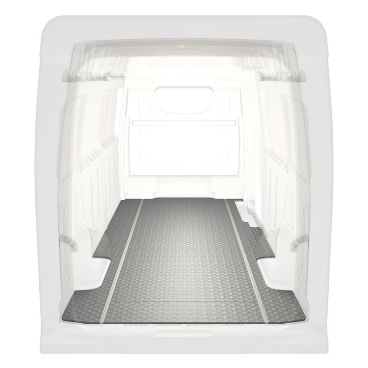 Lette og robuste standardgulve til varebiler til en Volkswagen Crafter / MAN TGE med skridsikker aluminiumsplade og lastskinner (langsgående) for hurtig og sikker installation af indretningssystemer og andet tilbehør.
