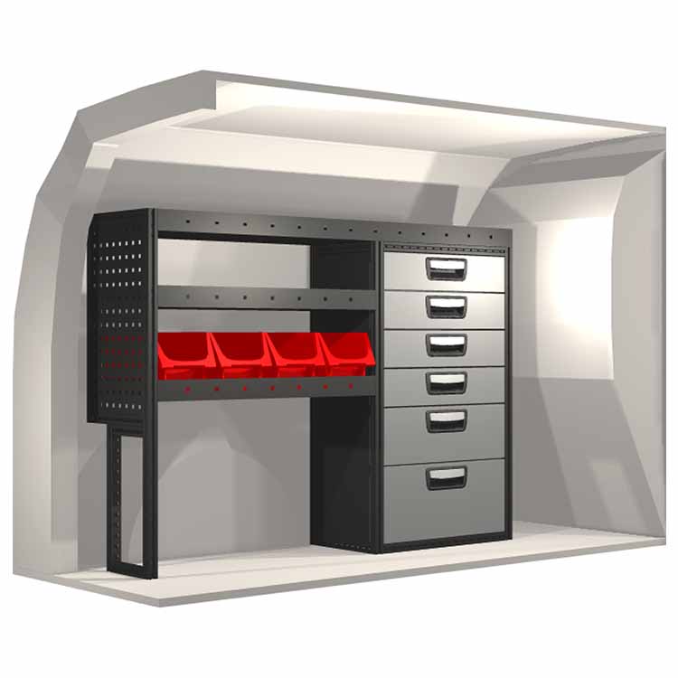 Indretningsforslaget er specielt designet til at passe valgte bilmodel perfekt. For øget funktionalitet og reduceret støj under kørslen er alle hylder udstyret med gummimåtter og skuffer med skum. Monteringssæt medfølger.