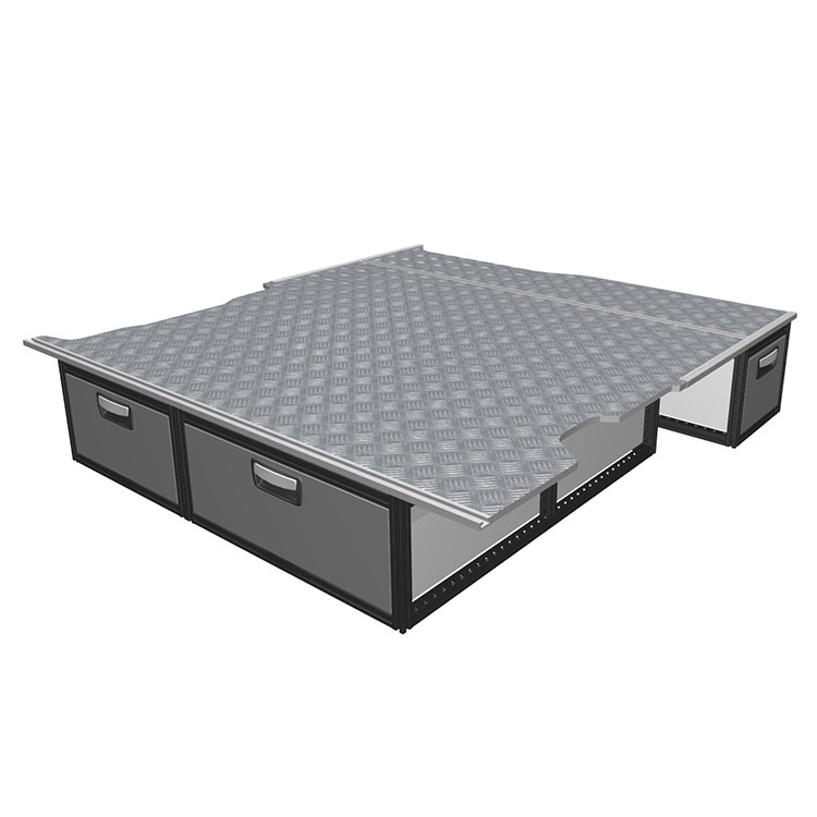 The kit is designed to be fitted on top of a wooden floor. The double floor is equipped with rails for easy installation of vehicle racking, and edging strips for a nice finish.