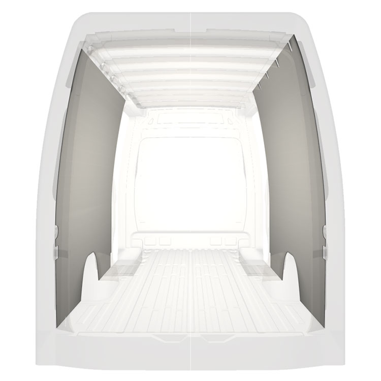 Let komplet beklædning til de indvendige vægge i en Mercedes Sprinter med dobbelte sidedøre. Beklædningen skaber et lyst og behageligt arbejdsmiljø og er nem at rengøre.
