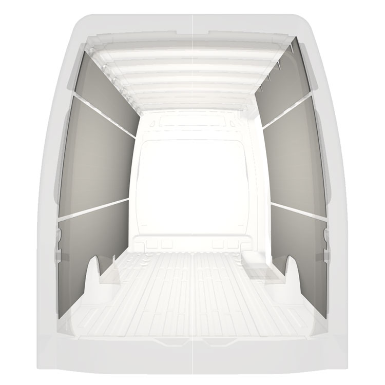Let panelbeklædning til de indvendige vægge i en Mercedes Sprinter med en sidedør til højre. Beklædningen skaber et lyst og behageligt arbejdsmiljø og er nem at rengøre.