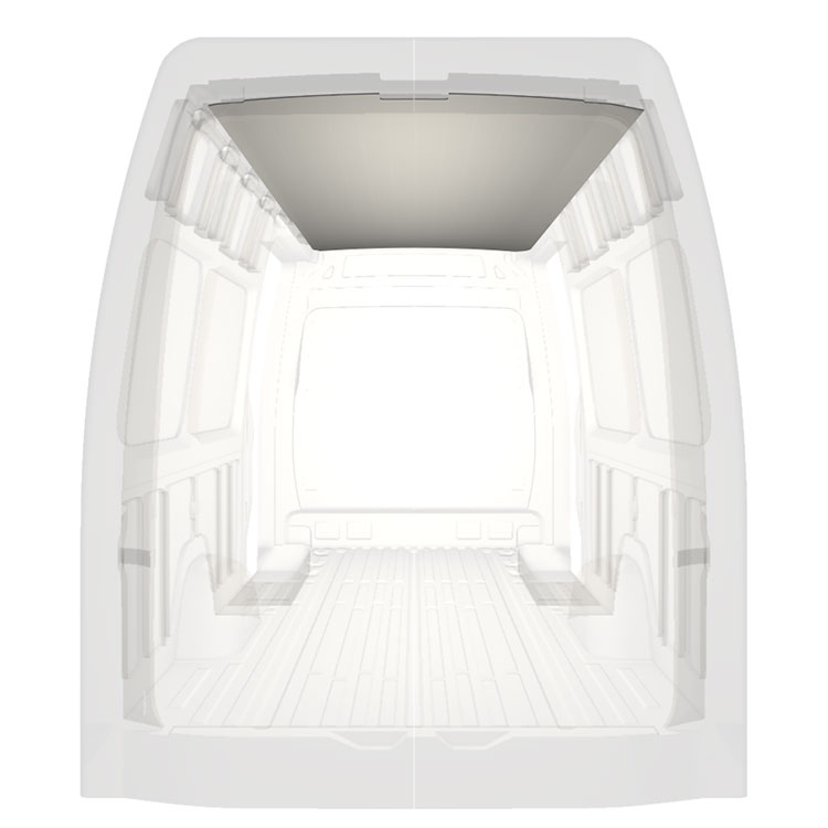 Let beklædning til taget på en Mercedes Sprinter. Tagbeklædningen vil skabe en lys professionel finish indvendigt og et behageligt arbejdsmiljø.