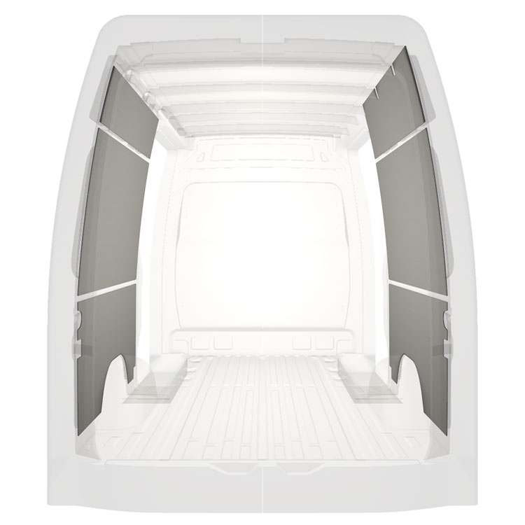 Let færdiglavet beklædning til de indvendige vægge af en Mercedes Sprinter ned dobbelte sidedøre. Beklædningen skaber et lyst og behageligt arbejdsmiljø og er nem at rengøre.