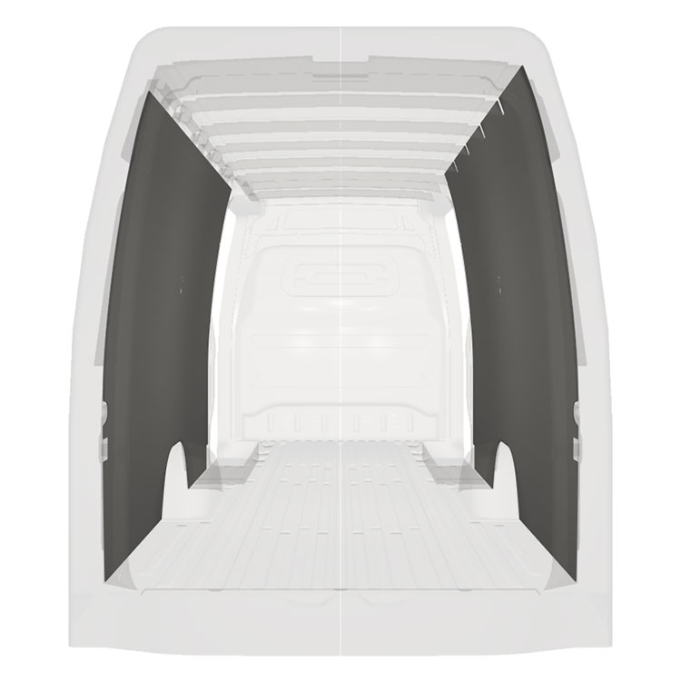 Let komplet beklædning til de indvendige vægge i en Mercedes Sprinter med dobbelte sidedøre. Beklædningen skaber et lyst og behageligt arbejdsmiljø og er nem at rengøre.