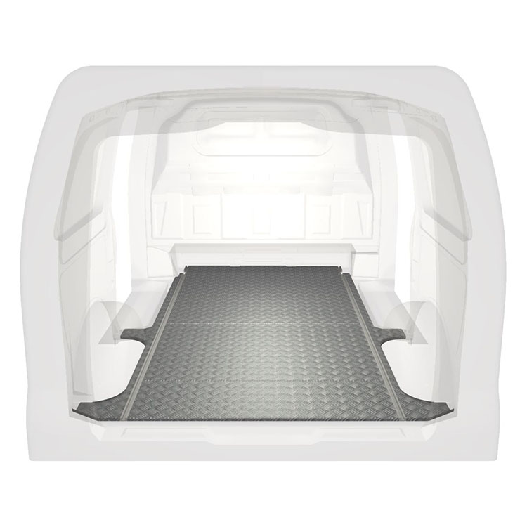 Lette og robuste standardgulve til varebiler til en Mercedes Vito med skridsikker aluminiumsplade og lastskinner (langsgående) for hurtig og sikker installation af indretningssystemer og andet tilbehør.