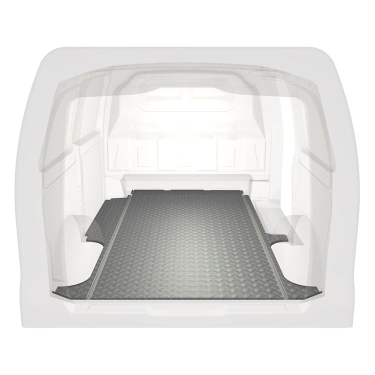 Lette og robuste ekstra lange gulve til en Mercedes Vito med skridsikker aluminiumsplade og lastskinner (langsgående) for hurtig og sikker installation af indretningssystemer og andet tilbehør.