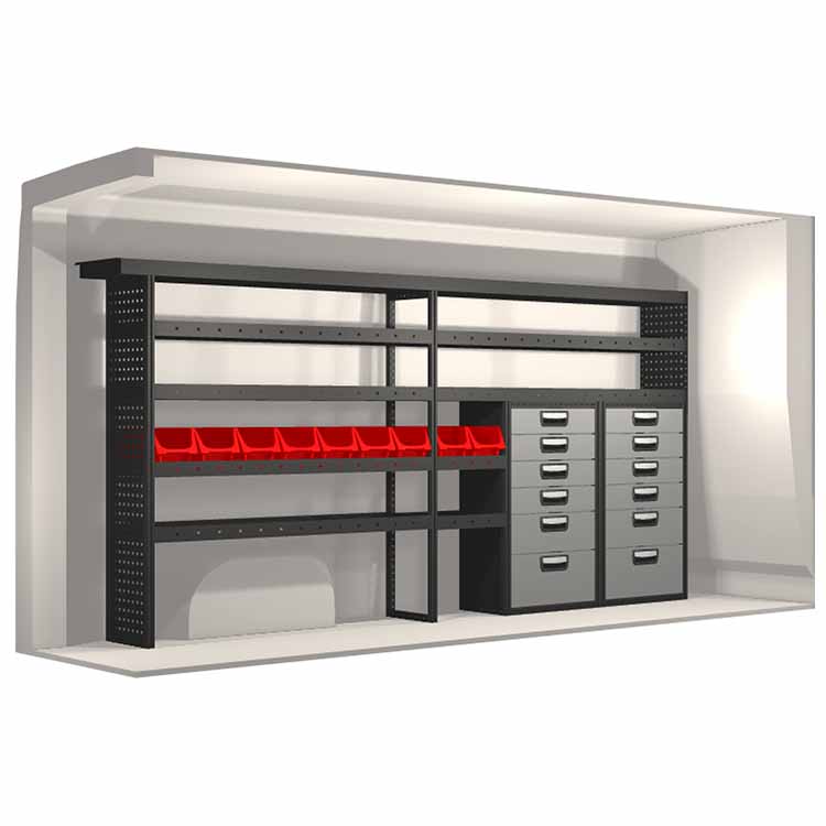Indretningsforslaget er specielt designet til at passe valgte bilmodel perfekt. For øget funktionalitet og reduceret støj under kørslen er alle hylder udstyret med gummimåtter og skuffer med skum. Monteringssæt medfølger.