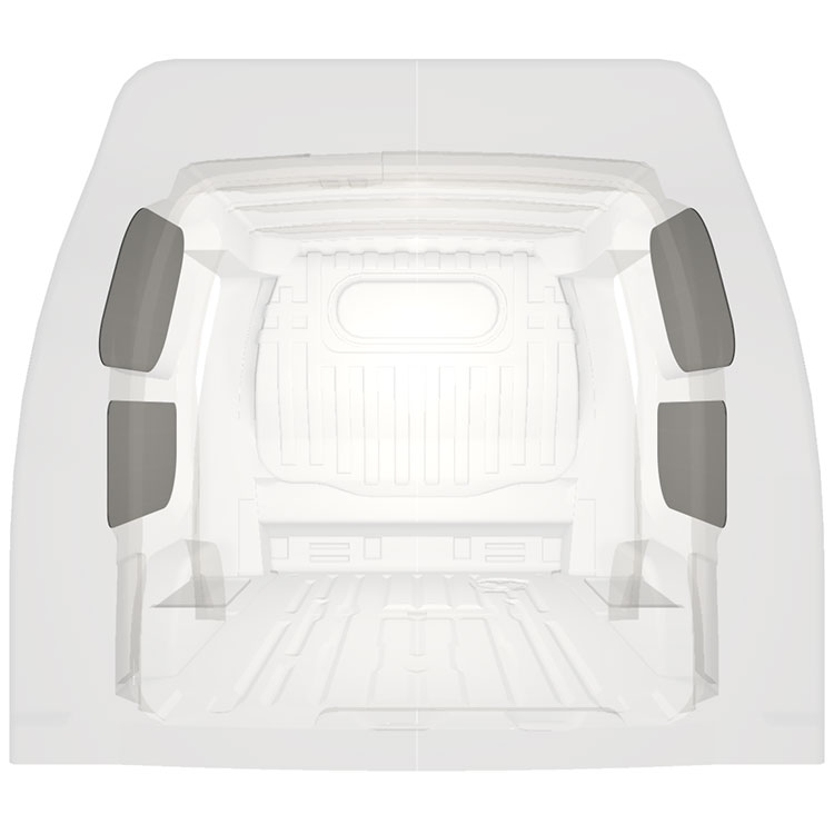 Let færdiglavet beklædning til de indvendige vægge af en Nissan NV200 ned dobbelte sidedøre. Beklædningen skaber et lyst og behageligt arbejdsmiljø og er nem at rengøre.