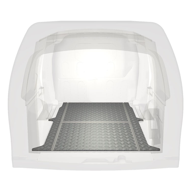 Lette og robuste gulve til varebiler med tværgående skinner til en Mercedes Citan / Renault Kangoo med skridsikker aluminiumsplade og lastskinner (langsgående og tværgående) for hurtig og sikker installation af indretningssystemer og andet tilbehør.