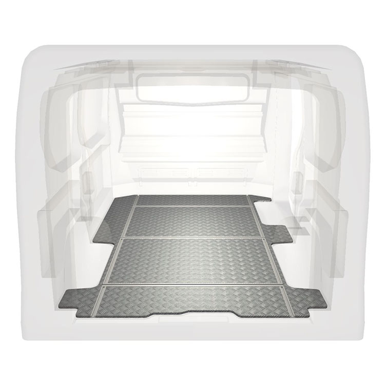 Lette og robuste gulve til varebiler med tværgående skinner til en Renault Trafic / Opel Vivaro / Fiat Talento / Nissan NV300 med skridsikker aluminiumsplade og lastskinner (langsgående og tværgående) for hurtig og sikker installation af indretningssystemer og andet tilbehør.
