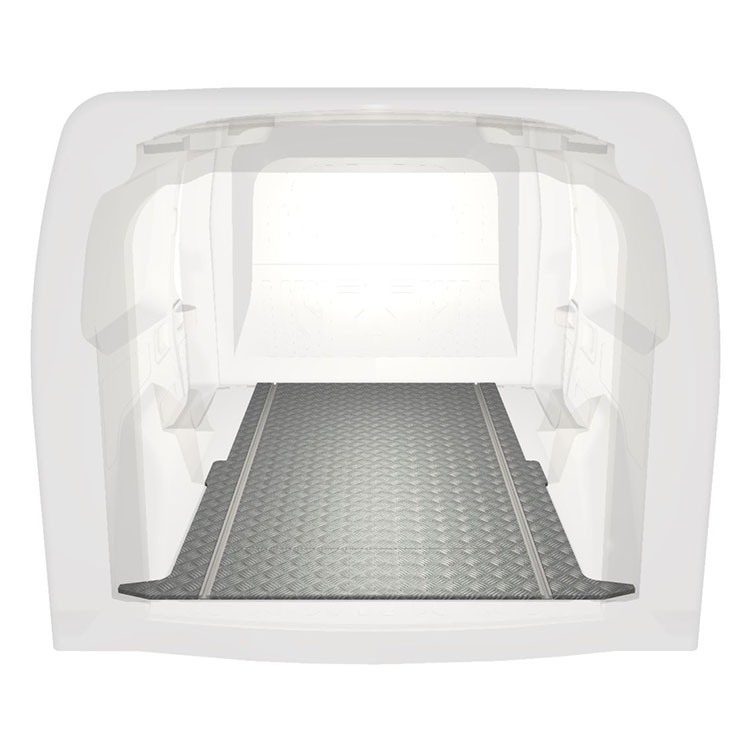 Lette og robuste ekstra lange gulve til en Opel Combo / Fiat Doblò med skridsikker aluminiumsplade og lastskinner (langsgående) for hurtig og sikker installation af indretningssystemer og andet tilbehør.