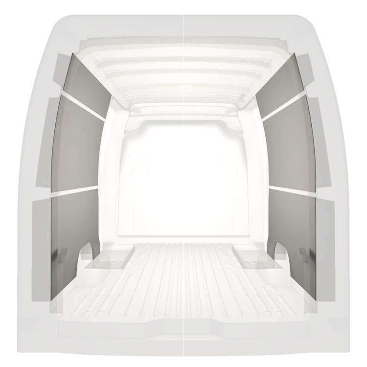 Let færdiglavet beklædning til de indvendige vægge af en Renault Master / Opel Movano / Nissan NV400 ned dobbelte sidedøre. Beklædningen skaber et lyst og behageligt arbejdsmiljø og er nem at rengøre.