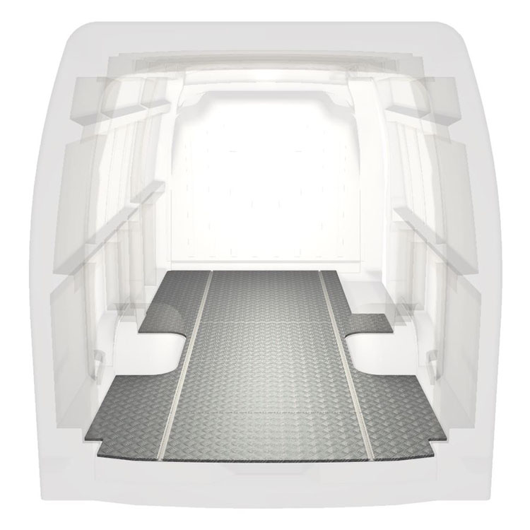 Lette og robuste standardgulve til varebiler til en Renault Master / Opel Movano / Nissan NV400 med skridsikker aluminiumsplade og lastskinner (langsgående) for hurtig og sikker installation af indretningssystemer og andet tilbehør.