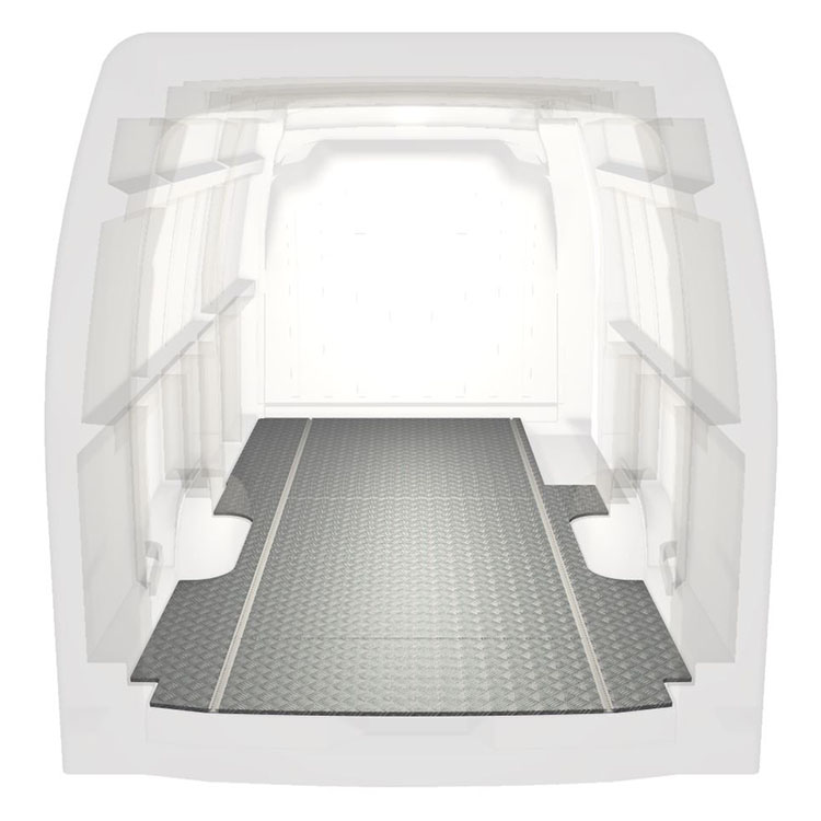 Lette og robuste standardgulve til varebiler til en Renault Master / Opel Movano / Nissan NV400 med skridsikker aluminiumsplade og lastskinner (langsgående) for hurtig og sikker installation af indretningssystemer og andet tilbehør.