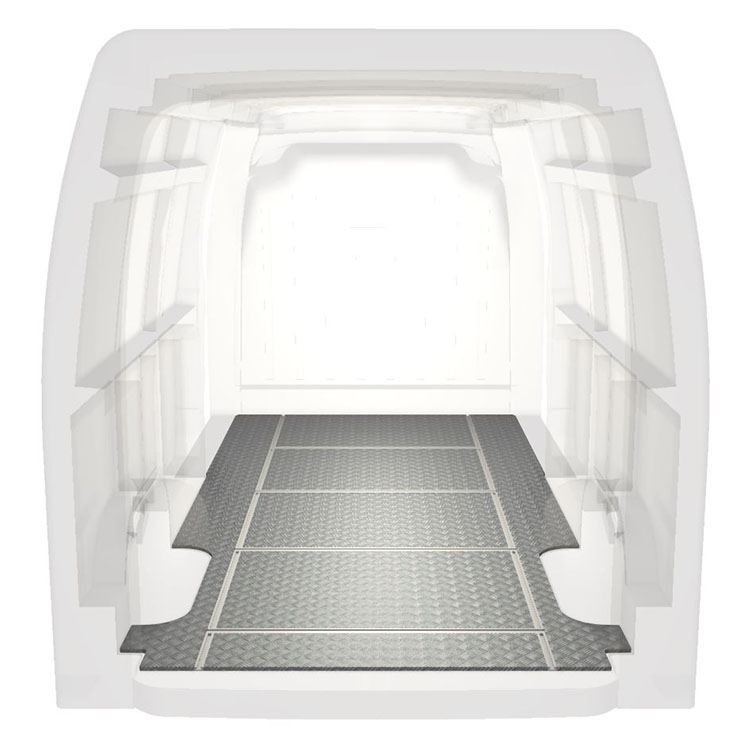 Lette og robuste gulve til varebiler med tværgående skinner til en Renault Master / Opel Movano / Nissan NV400 med skridsikker aluminiumsplade og lastskinner (langsgående og tværgående) for hurtig og sikker installation af indretningssystemer og andet tilbehør.