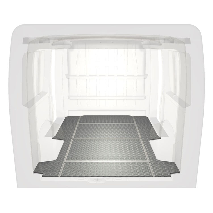Lette og robuste gulve til varebiler med tværgående skinner til en Citroën Jumper / Peugeot Boxer / Fiat Ducato med skridsikker aluminiumsplade og lastskinner (langsgående og tværgående) for hurtig og sikker installation af indretningssystemer og andet tilbehør.