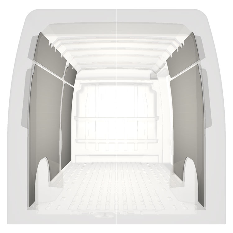 Let komplet beklædning til de indvendige vægge i en Citroën Jumper / Peugeot Boxer / Fiat Ducato med en sidedør til højre.Beklædningen skaber et lyst og behageligt arbejdsmiljø og er nem at rengøre.