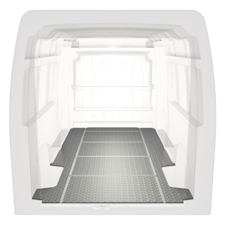 Lette og robuste gulve til varebiler med tværgående skinner til en Citroën Jumper / Peugeot Boxer / Fiat Ducato med skridsikker aluminiumsplade og lastskinner (langsgående og tværgående) for hurtig og sikker installation af indretningssystemer og andet tilbehør.