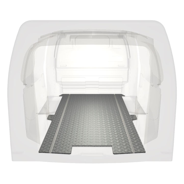 Lette og robuste ekstra lange gulve til en Citroën Jumpy / Peugeot Expert / Toyota ProAce med skridsikker aluminiumsplade og lastskinner (langsgående) for hurtig og sikker installation af indretningssystemer og andet tilbehør.