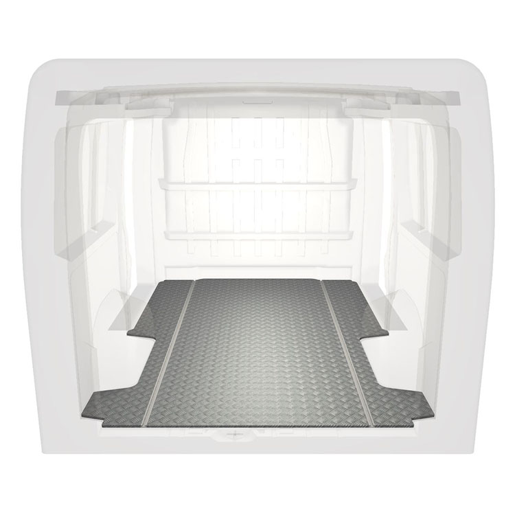 Lette og robuste ekstra lange gulve til en Citroën Jumper / Peugeot Boxer / Fiat Ducato med skridsikker aluminiumsplade og lastskinner (langsgående) for hurtig og sikker installation af indretningssystemer og andet tilbehør.