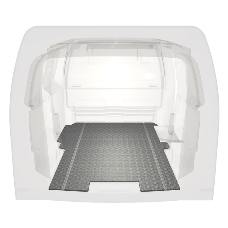 Lette og robuste standardgulve til varebiler til en Citroën Jumpy / Peugeot Expert / Toyota ProAce med skridsikker aluminiumsplade og lastskinner (langsgående) for hurtig og sikker installation af indretningssystemer og andet tilbehør.