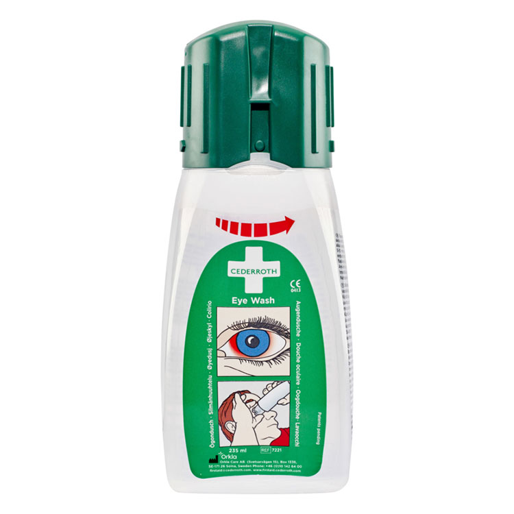 A pocket-size personal eye wash bottle that can be kept conveniently in your pocket or the holster that goes with it. This makes it available immediately in the event of an accident. Small, easy-to-use bottle with an ergonomic eye cup and a generous flow of fluid. Quick and easy to open. Cederroth Eye Wash is opened using one easy movement. Simply twist the bottle to open it!