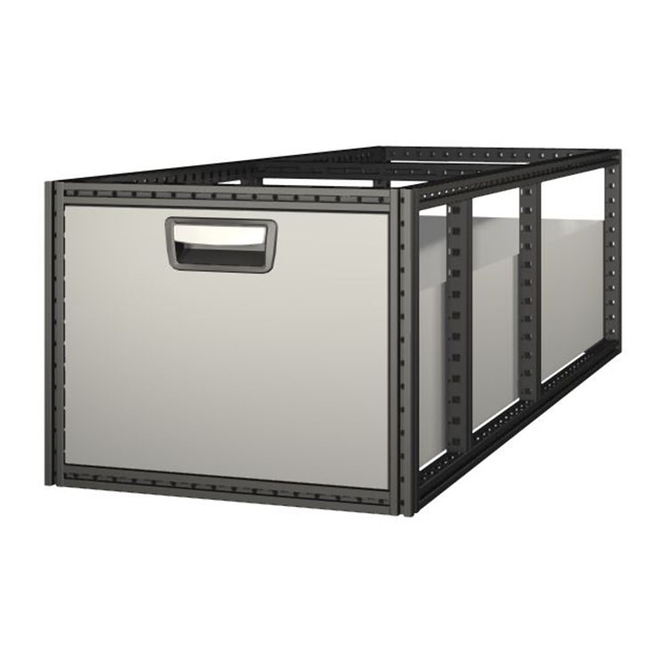 De ekstra lange skuffeenheder har en ramme af ultrastærkt stål og skuffer af aluminium. Skufferne er som standard udstyret med kuglelejer, og blandingen af faste og fleksible lejer gør dem både stabile og nemme at betjene.