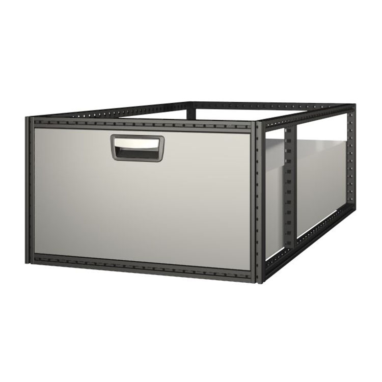 De ekstra lange skuffeenheder har en ramme af ultrastærkt stål og skuffer af aluminium. Skufferne er som standard udstyret med kuglelejer, og blandingen af faste og fleksible lejer gør dem både stabile og nemme at betjene.