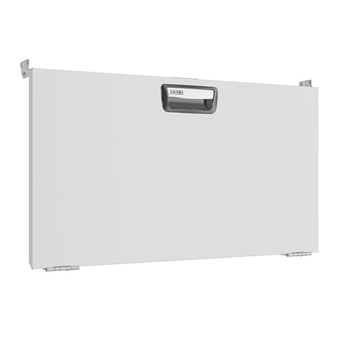 Drop down doors are fitted with gas springs on both sides that ensure smooth opening and closing. The opening angle is 90 degrees. The door pull has a built-in catch that prevents it from opening while the vehicle is in motion. The door is also suitable for wheel arch frames fitted with bench tops. When fitting doors between two shelf end supports, a mounting frame must be used.