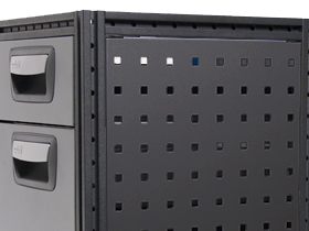 The hole pattern permits attachment of accessories such as mesh baskets and form holders. When combined with tool holders, they provide versatile and convenient tool storage. The tool boards are mounted using clips.