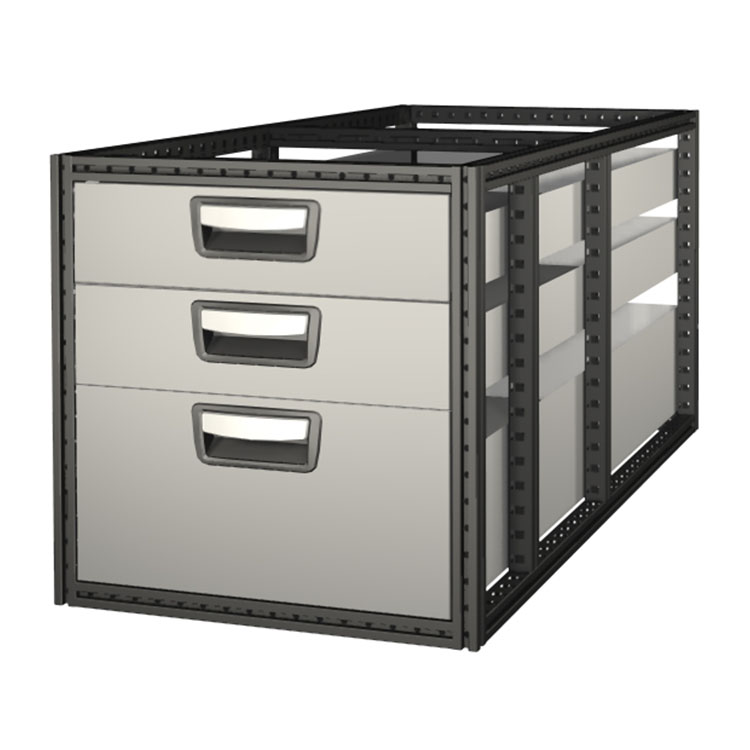 De ekstra lange skuffeenheder har en ramme af ultrastærkt stål og skuffer af aluminium. Skufferne er som standard udstyret med kuglelejer, og blandingen af faste og fleksible lejer gør dem både stabile og nemme at betjene.