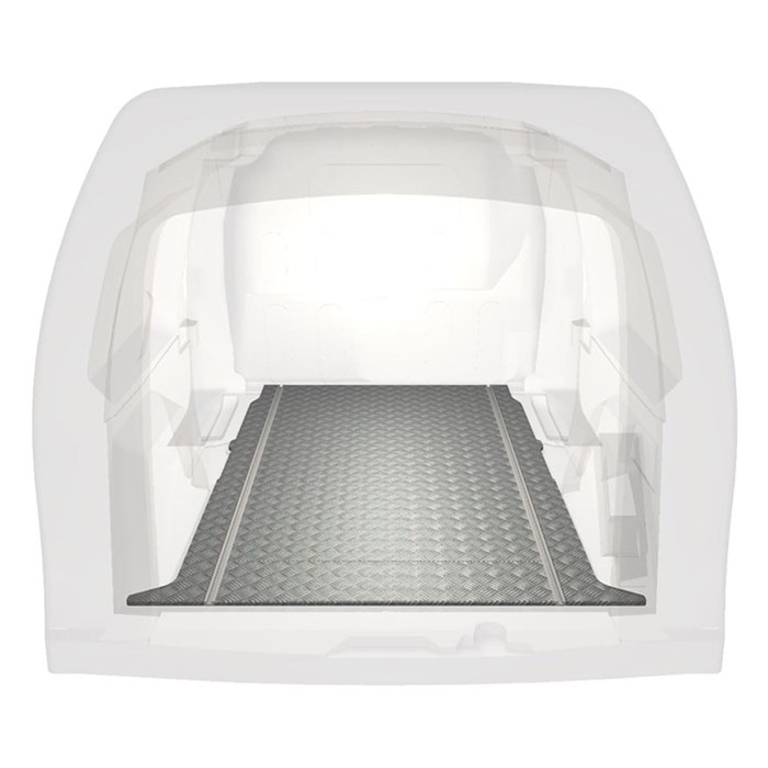 Lette og robuste ekstra lange gulve til en Mercedes Citan / Renault Kangoo med skridsikker aluminiumsplade og lastskinner (langsgående) for hurtig og sikker installation af indretningssystemer og andet tilbehør.