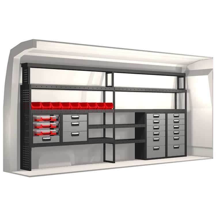 Indretningsforslaget er specielt designet til at passe valgte bilmodel perfekt. For øget funktionalitet og reduceret støj under kørslen er alle hylder udstyret med gummimåtter og skuffer med skum. Monteringssæt medfølger.
