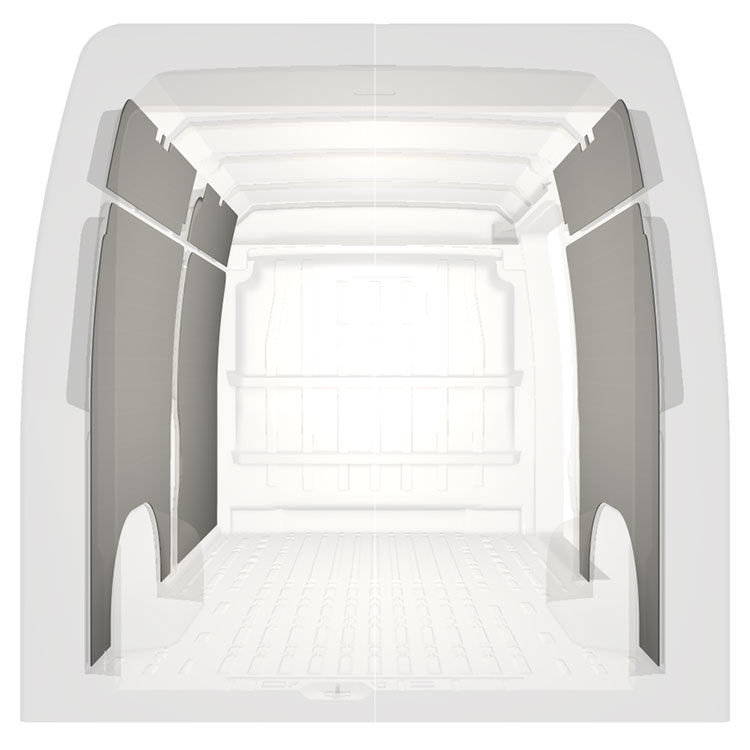 Let komplet beklædning til de indvendige vægge i en Citroën Jumper / Peugeot Boxer / Fiat Ducato med en sidedør til højre.Beklædningen skaber et lyst og behageligt arbejdsmiljø og er nem at rengøre.