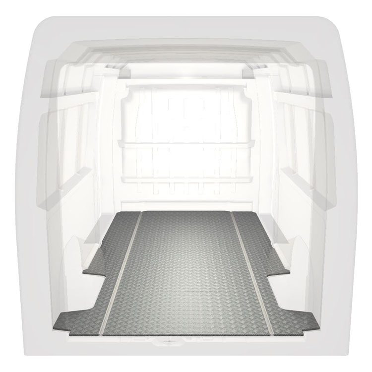 Lette og robuste standardgulve til varebiler til en Citroën Jumper / Peugeot Boxer / Fiat Ducato med skridsikker aluminiumsplade og lastskinner (langsgående) for hurtig og sikker installation af indretningssystemer og andet tilbehør.