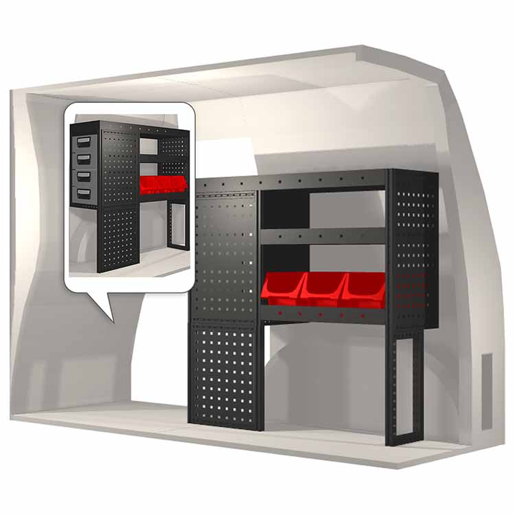 Indretningsforslaget er specielt designet til at passe valgte bilmodel perfekt. For øget funktionalitet og reduceret støj under kørslen er alle hylder udstyret med gummimåtter og skuffer med skum. Monteringssæt medfølger.