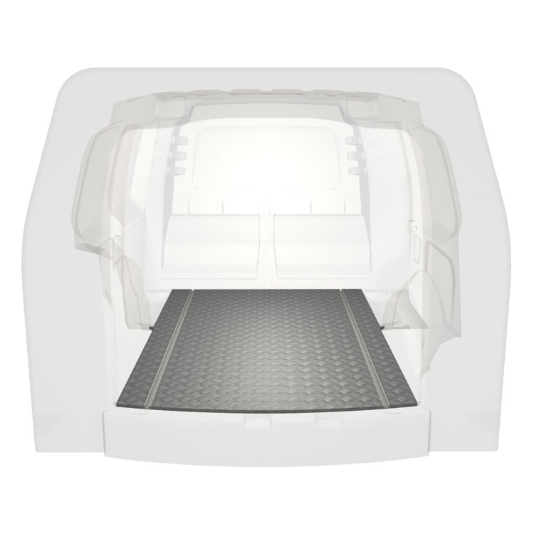 Let og robust XL-gulv til en Volkswagen Caddy Cargo 20- med skridsikker aluminiumsplade og lastskinner (langsgående) for hurtig og sikker installation af indretningssystemer og andet tilbehør.