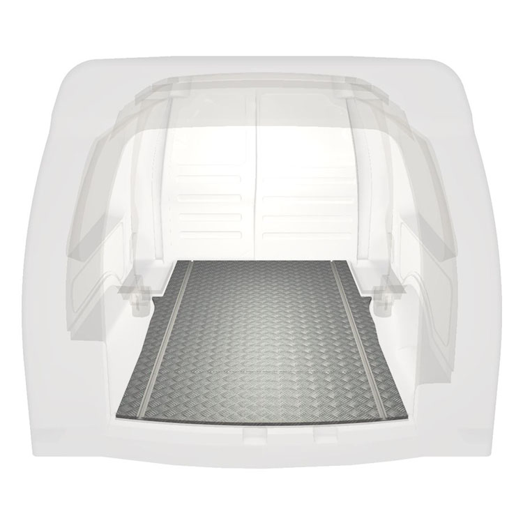 Lette og robuste ekstra lange gulve til en Volkswagen Caddy Maxi med skridsikker aluminiumsplade og lastskinner (langsgående) for hurtig og sikker installation af indretningssystemer og andet tilbehør.