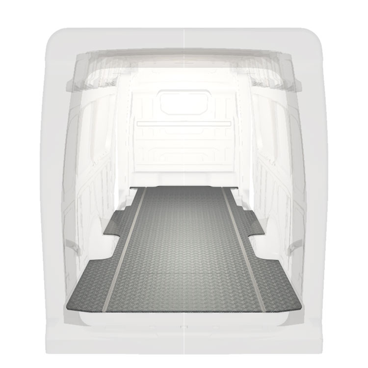 Lette og robuste standardgulve til varebiler til en Volkswagen Crafter / MAN TGE med skridsikker aluminiumsplade og lastskinner (langsgående) for hurtig og sikker installation af indretningssystemer og andet tilbehør.